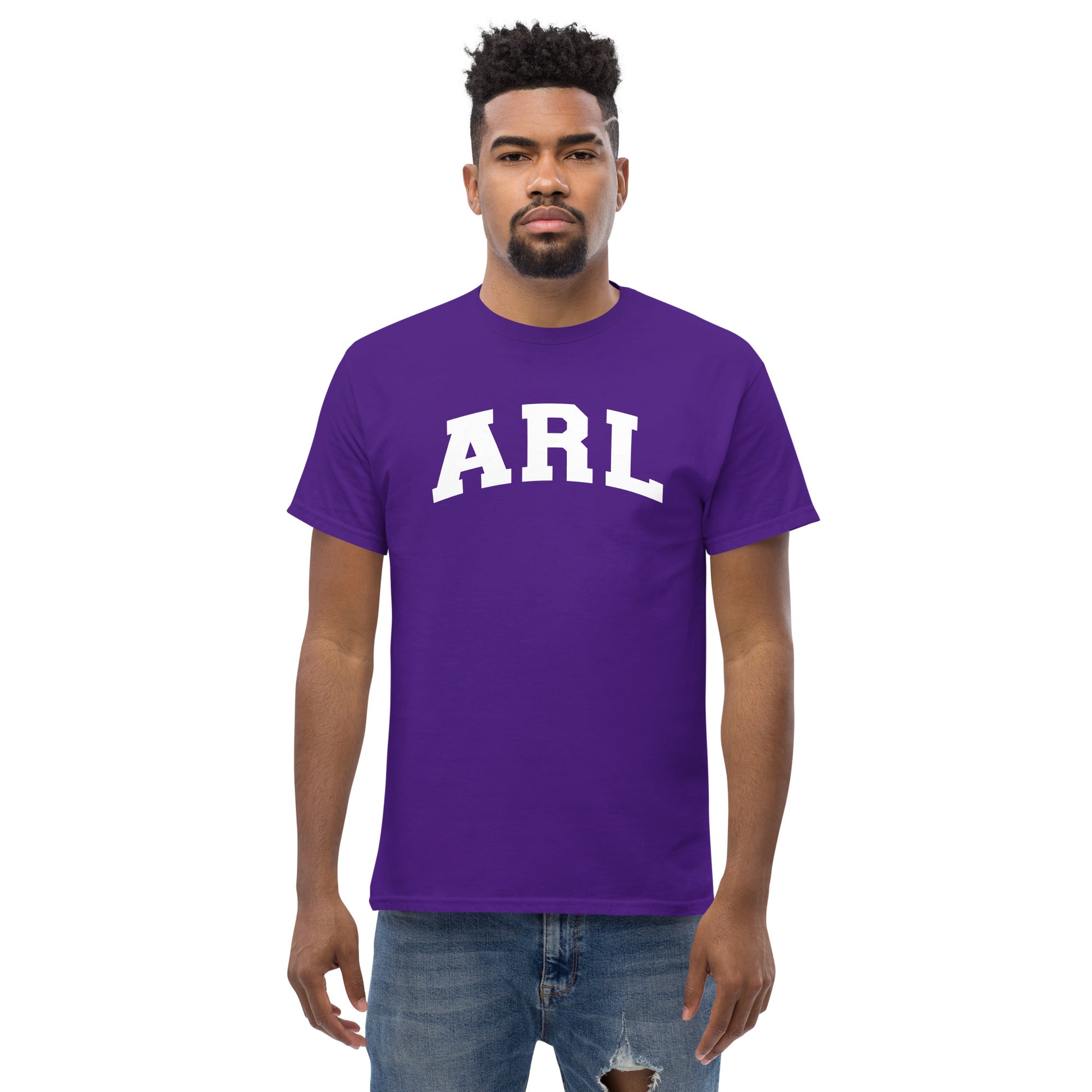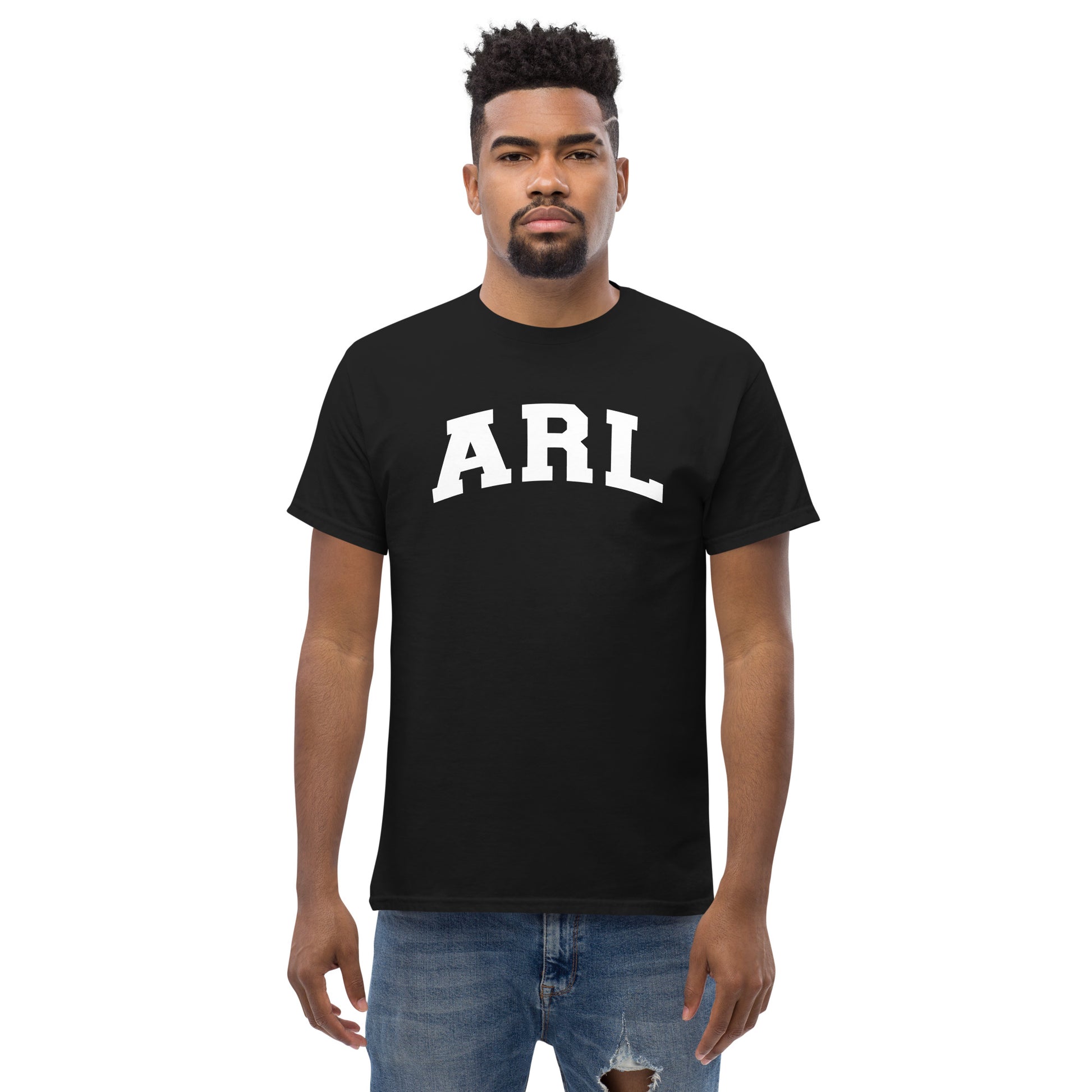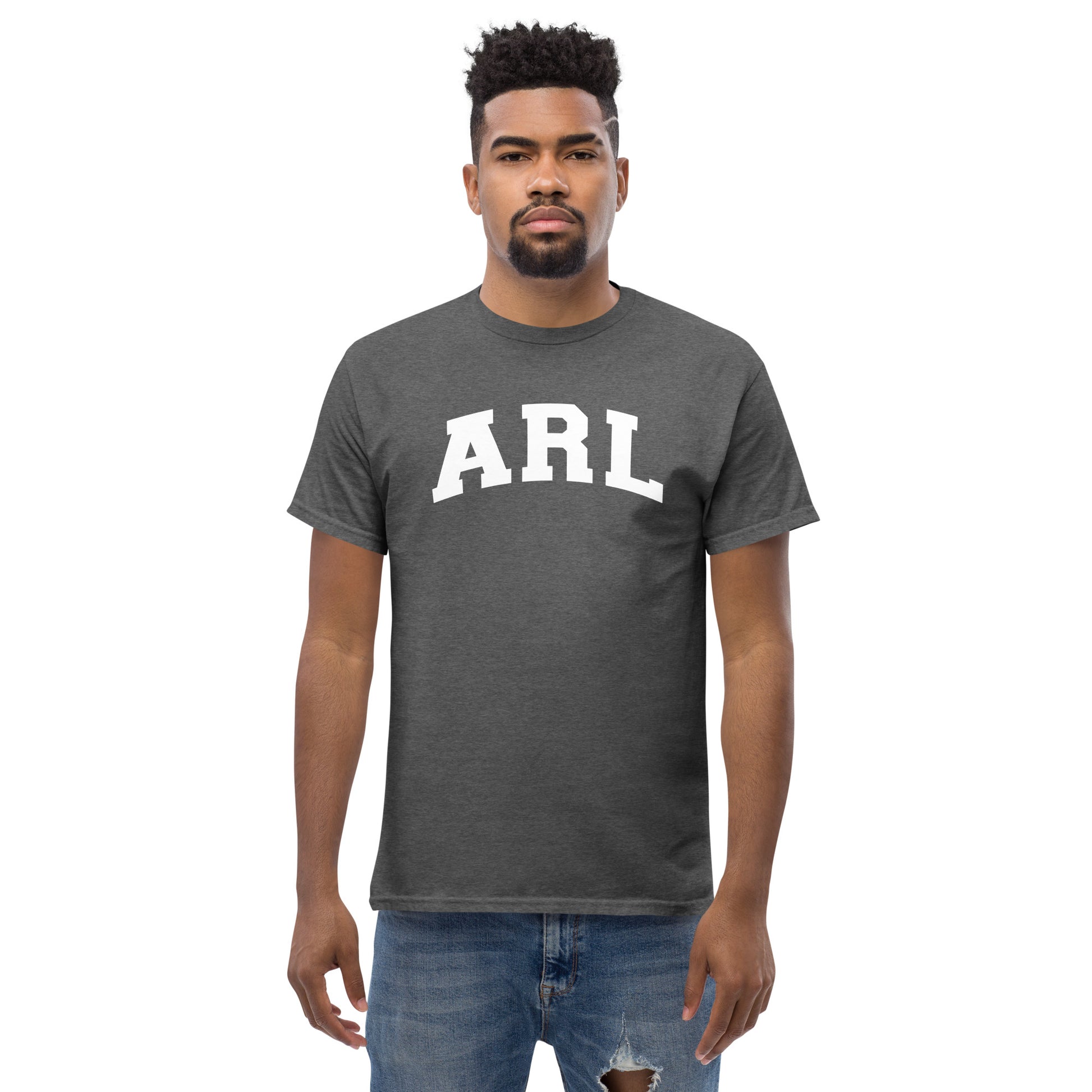Printed block letters ARL adorn the front of this Gildan 5000 t-shirt.